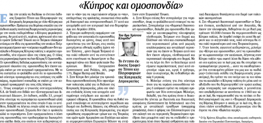 1. Όπως αναφέρει ο γνωστός συνταγματολόγος S.A. de Smith στο βιβλίο του «Συνταγματικό και Διοικητικό Δίκαιο, 2η έκδοση, σελίδα 33 , μπορεί ένα σύστημα να περιγράφεται ομοσπονδιακό αλλά στην πραγματικότητα να είναι ενιαίο ή και το αντίθετο, δηλαδή να λέγεται ενιαίο αλλά να λειτουργεί σαν ομοσπονδιακό. Σημασία δεν έχει η ορολογία αλλά το περιεχόμενο. Στην πραγματικότητα η λύση της Ομοσπονδίας που προδιαγράφεται βασισμένη στο σχέδιο Ανάν, στο οποίο οι νυν κυβερνώντες είπαν το «όχι» για να τσιμεττώσουν σήμερα το «ναι», ανεξαρτήτως της ορολογίας ουσιαστικά είναι καθαρά διχοτομική και συνομοσπονδιακή. Γι’ αυτό και απερρίφθη από τον Κυπριακό λαό στο δημοψήφισμα του Απριλίου 2004.