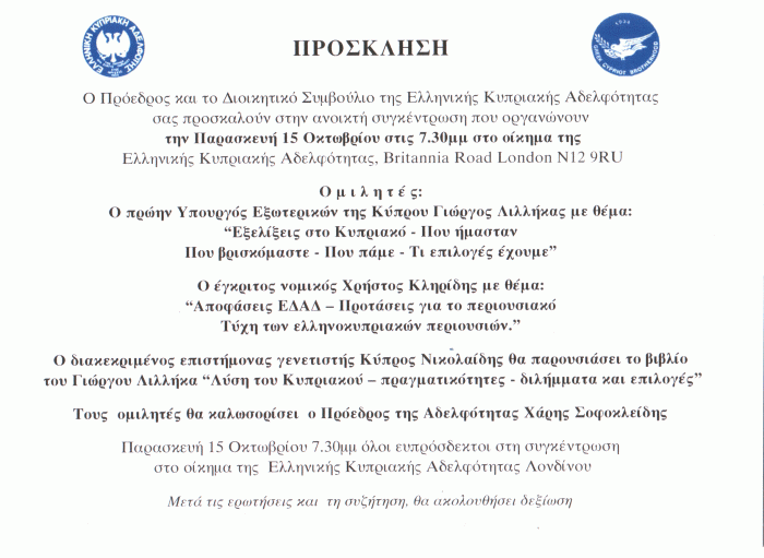 Ομιλία - Συζήτηση με τους Δρ. Χρίστο Κληρίδη και κο Γίωργο Λιλλίκα