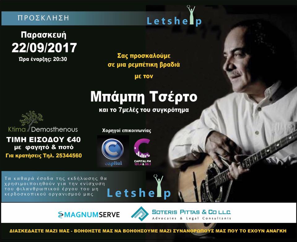 Ο μη κερδοσκοπικός Οργανισμός LETSHELP διοργάνωσε φιλανθρωπική εκδήλωση στις 22 Σεπτεμβρίου 2017 στο Κτήμα Δημοσθένους. Μια ρεμπέτικη βραδιά με τον γνωστό Έλληνα μουσικό Μπάμπη. Χαρά μας να βρισκόμαστε ανάμεσα στους χορηγούς!