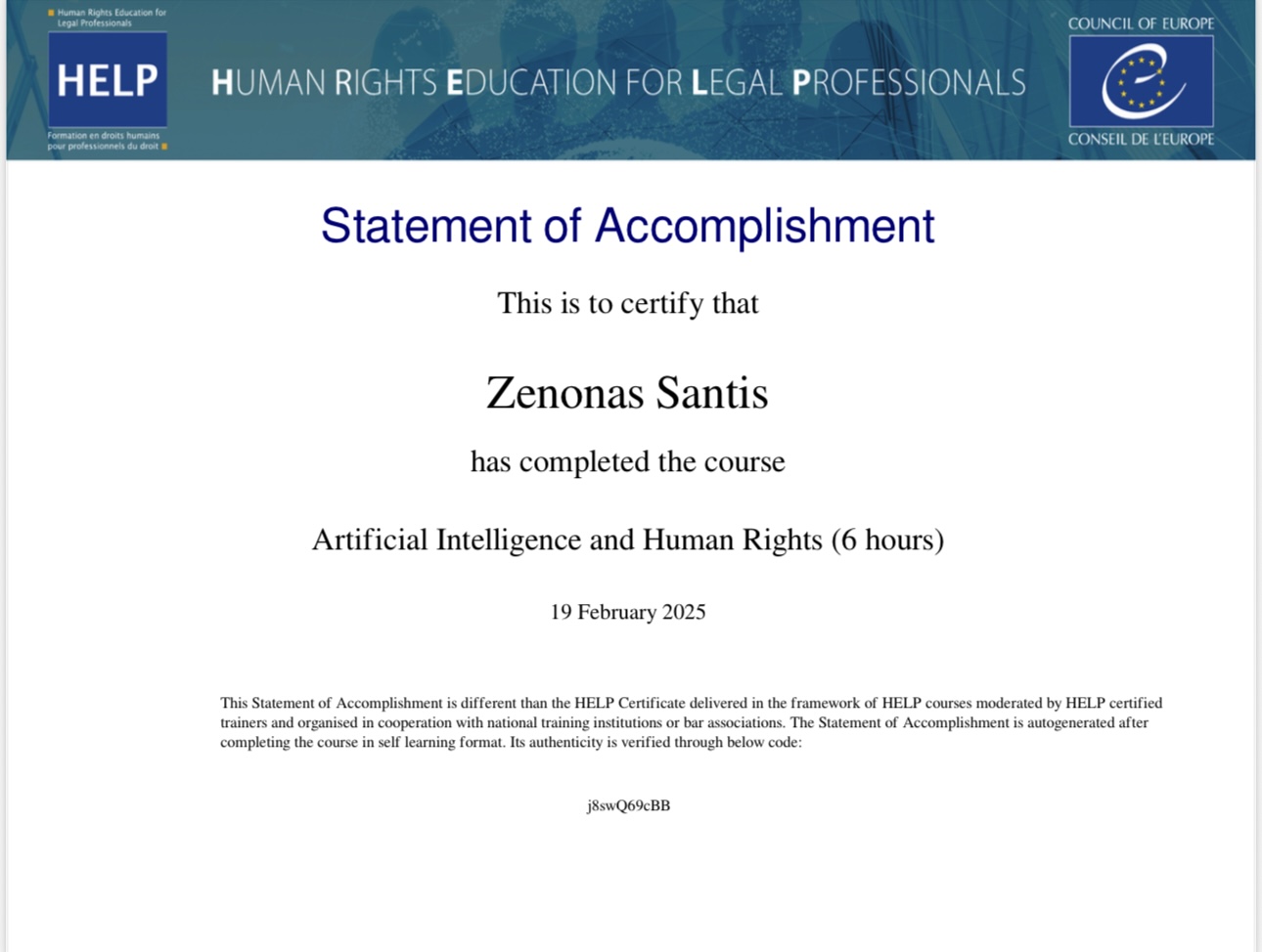 Our associate Zenonas Santis successfully completed 6hrs training for the course Artificial Intelligence and Human Rights moderated by the Human Rights Education for Legal Professionals.