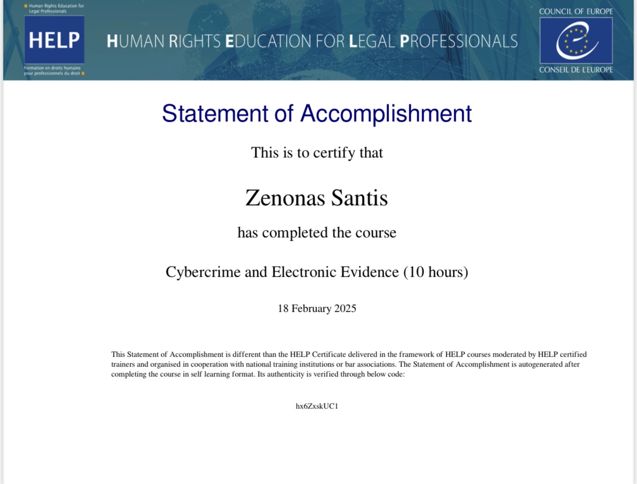 Our associate Zenonas Santis successfully completed 10hrs training for the course Cybercrime and Electronic Evidence moderated by the Human Rights Education for Legal Professionals.
